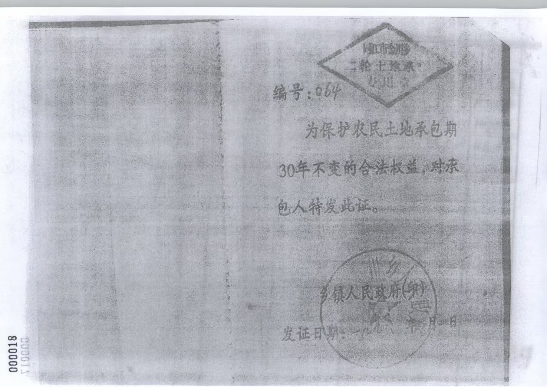 这份《土地承包经营权证》上,还清楚标记着:为保护农民土地承包期30年不变的合法权益,对承包人特发此证。