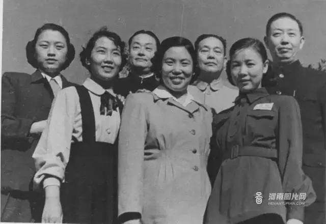 图为1958年,常香玉(中)在全国人代会上和梅兰芳、程砚秋、周信芳、袁雪芬、田华等合影。)
