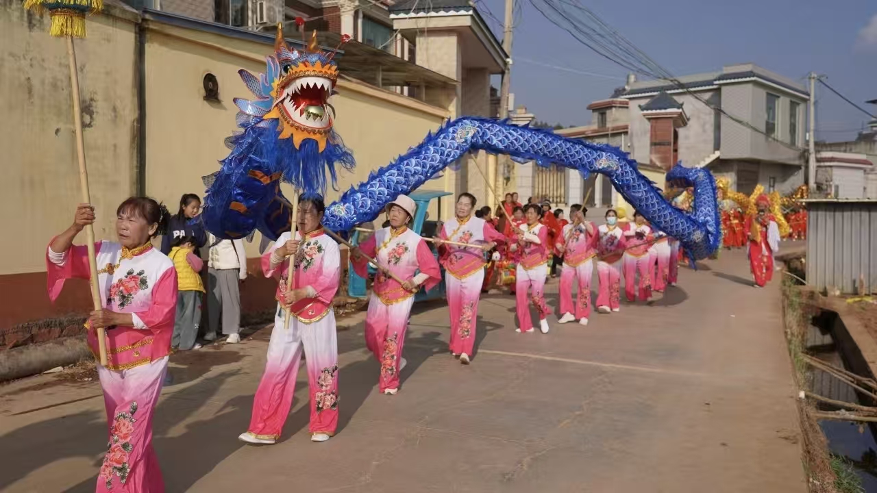 巡游队伍穿行于村间巷道,时而驻足表演。在田间地头,腾飞的龙灯寄托着对风调雨顺、五谷丰登的期盼;在居民小巷,翻动的龙身承载着家宅安宁、人丁兴旺的祝愿;行至居委会门前,起舞的祥龙更蕴含着政通人和、国泰民安的祈望。每一个托着龙灯、抡圆胳膊的舞龙者,都将心底的美好祝愿化作肢体的律动;每一个用力敲打鼓点的乐手,都将对来年的希冀融进铿锵的节奏。龙灯所至,欢声笑语不断,年味在乡邻间流淌。
