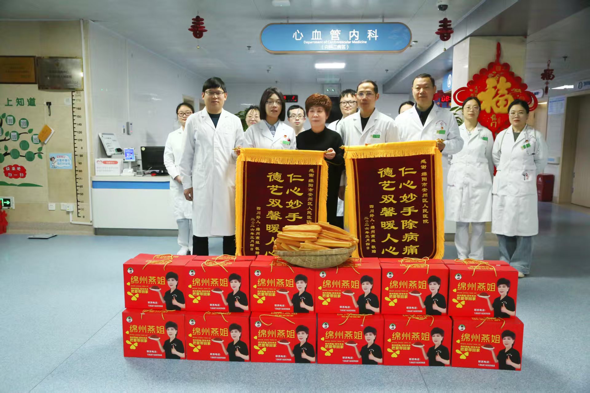在三八节来临之际,2026年3月4日,凌晨1点钟左右燕姐就开始进厨房忙碌着炸油条,一直忙到早上6点钟,几百根油条才炸完。接着早上7点钟就出发去绵阳市安州区人民医院,医院院长孙军,副院长黄光强,心血管内科主治医师李全有等医护人员一同在等着燕姐的到来,燕姐亲手将两面锦旗分别赠予医院和心血管内科,燕姐特别感谢主治医师李全有精湛的医疗技术及医护人员的细致入微的照护,才得以康复。燕姐还送上自己亲手炸制的油条和精心准备的节日礼品。医院的医护人员对燕姐顺利康复表示由衷高兴并献上鲜花,致以最诚挚的祝福。