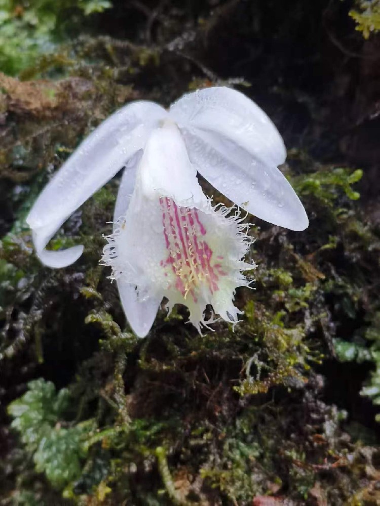 凤凰新闻网络电视台讯(记者张红飞 通讯员革文艳 彭明统 )近日,云南高黎贡山国家级自然保护区保山管护局腾冲分局工作人员在开展日常巡护时,邂逅“一群”体态优雅、翩翩起舞的“白色蝴蝶”。经专家鉴定,确定为兰科独蒜兰属珍稀附生草本植物矮小独蒜兰。矮小独蒜兰(学名:Pleione humilis ),兰科独蒜兰属,附生或岩生低矮草本,假鳞茎橄榄绿,卵状圆锥形,上端有长颈,顶端具1枚叶。先花后叶,叶披针形至椭圆形。每个花序具花1-2朵,花朵开展并向下垂,萼片、花瓣和唇瓣白色,唇瓣上有深红色或黄棕色的班点和条纹,唇瓣中央有淡黄色带;中夢片线性倒披针形,侧夢片斜倒披针形,花瓣斜线性倒披针形,唇瓣长椭圆形,不明显3裂,基部囊肿,上半部边缘撕裂状,先端微凹,侧裂片直立并弯曲,胼胝体由5-7条具髯毛的褶片组成,花期2-3月。该物种被列入《中国国家重点保护野生植物名录》(二级),世界自然保护联盟(IUCN)评定其为极危(CR)等级。此次发现,刷新了矮小独蒜兰在高黎贡山腾冲辖区的物种分布记录。