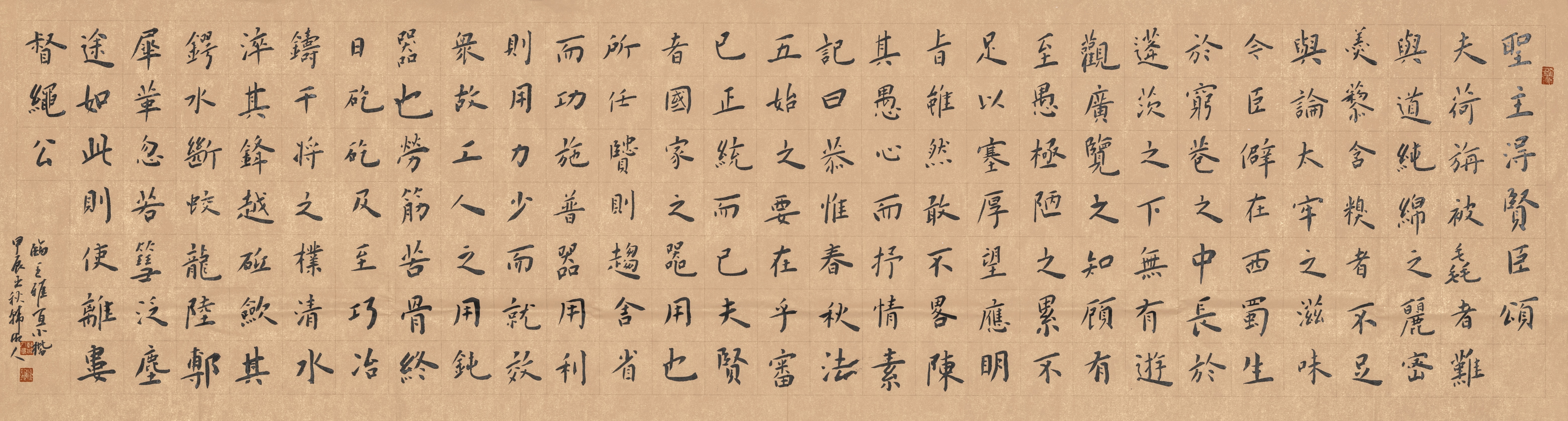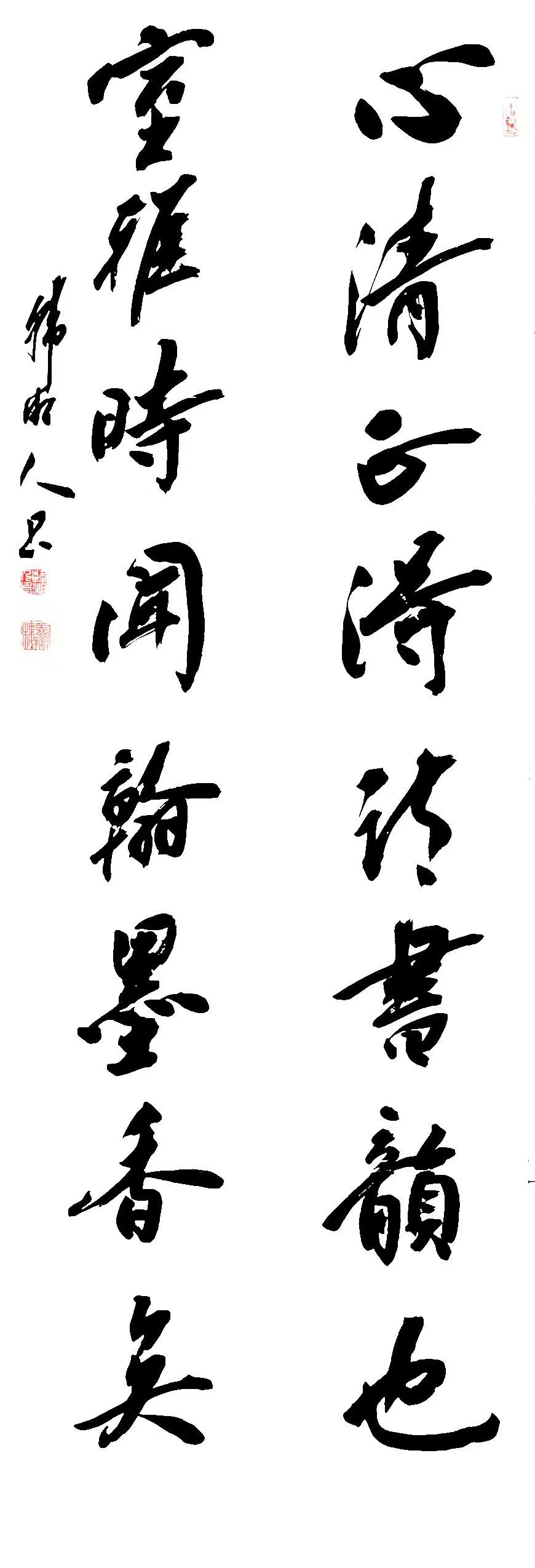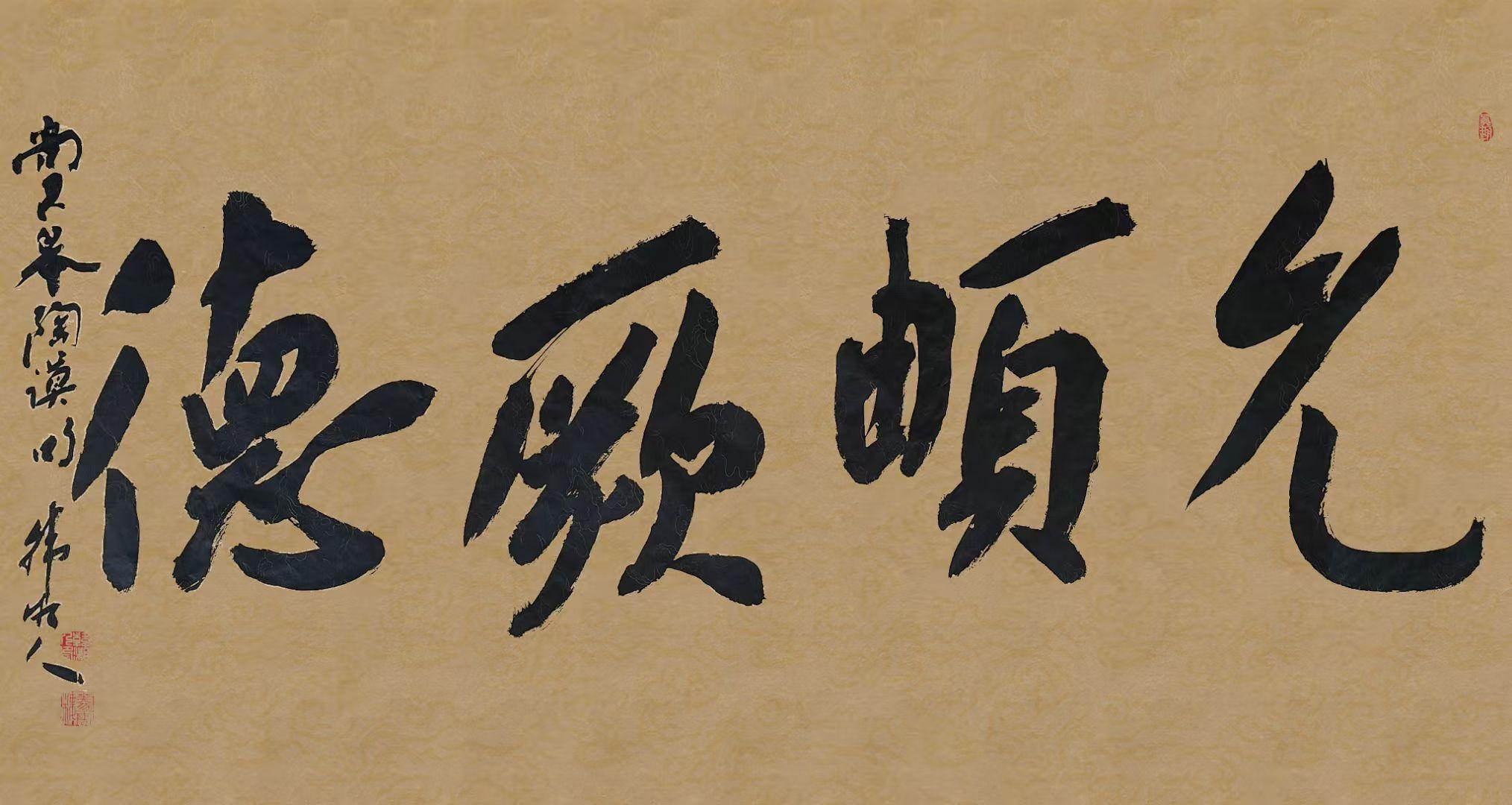 看着他的原创作品,其楷书《王褒·圣主得贤臣颂》长卷再现王宠“秀逸温润”特质,行草《李白·行路难》两条屏融合王宠风骨与李白诗韵,榜书“允迪厥德”“万几无旷”气势磅礴,既有王宠的疏朗空灵,又有自己的雄强厚重,是对王宠书法的最好传承,更是对魏晋风骨的最好致敬。这也让我更加坚信,王宠这座书法丰碑,之所以能在五百年后依旧熠熠生辉,正是因为有韩湘人这样的传承者,以笔墨为桥、以学术为径,让千年风骨得以延续,这也是我在前后关注与创作中,始终坚守的核心立意——唯有传承,方能让丰碑永立。