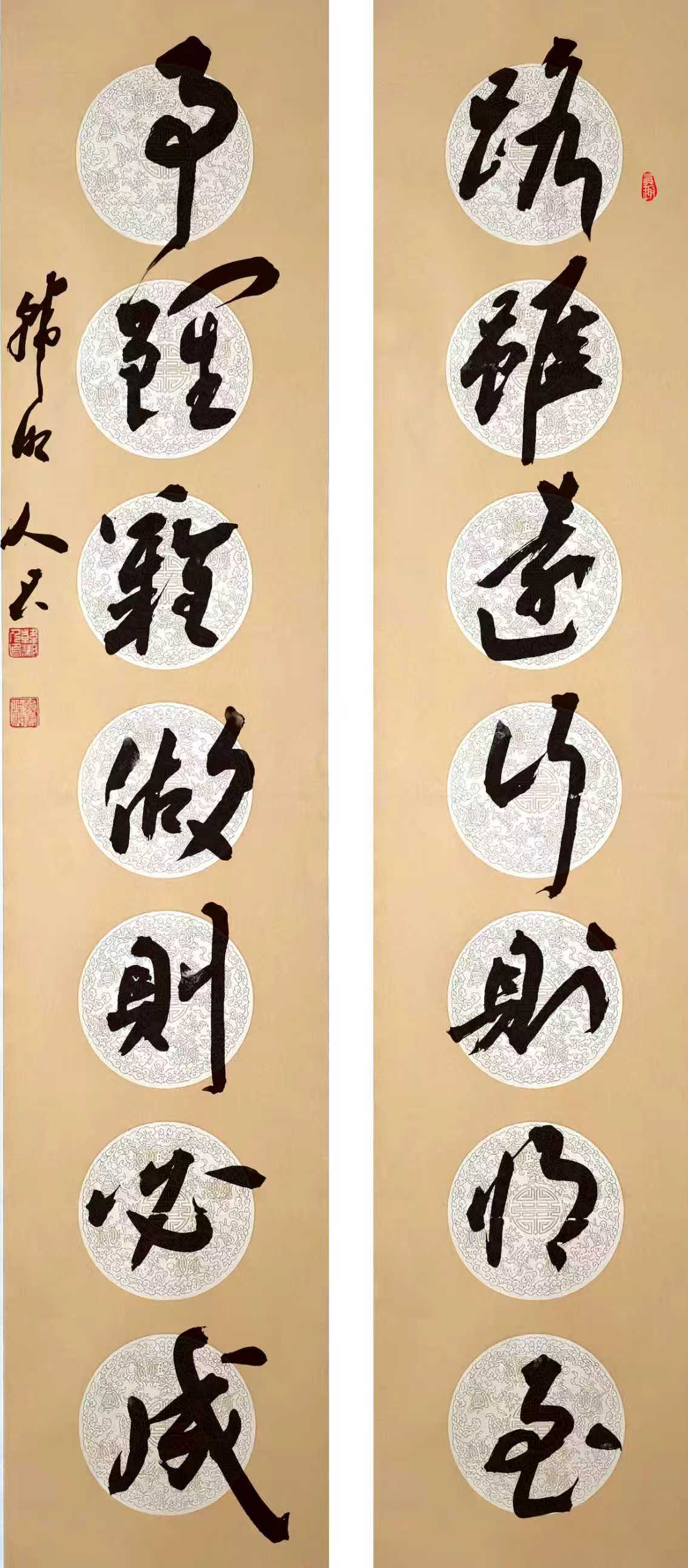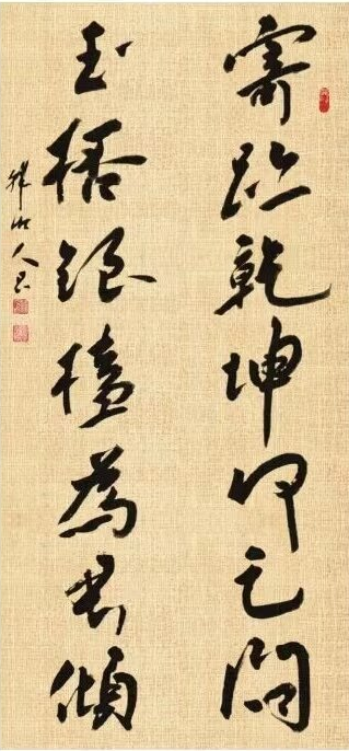 在笔法与线条上,韩湘人在保留王宠中锋圆转、温润含蓄特质的基础上,融入了更丰富的笔墨变化与力量感。王宠书法以小字见长,线条纤秀空灵,而韩湘人将其精微笔法放大,无论是小字行草,还是榜书楹联,皆笔力雄健,线条苍浑厚重,既保留王宠的雅逸,又增添了当代书法的气势与张力。他打破王宠书法 “娟秀内敛” 的固有格局,在线条中融入轻重、缓急、枯润的微妙对比,使原本简约的点画具备了更强的节奏感与表现力。针对当代展厅视觉审美,他适度强化了提按顿挫的幅度,让线条在温润中不失筋骨,在含蓄中暗藏锋芒,实现了 “以大显小,以厚显雅”的视觉突破,让王宠书风既有晋人的清韵,又有当代的厚重。