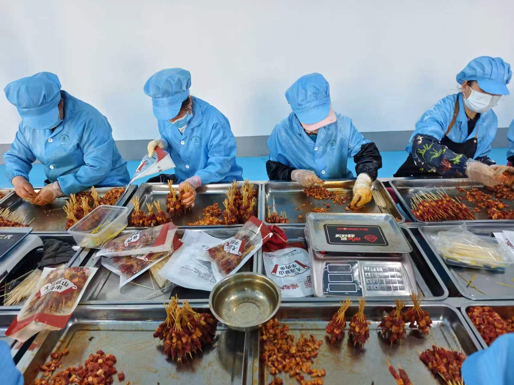 分割完成的优质牛羊肉,随即送入云南大海草山牧业有限公司专业加工车间,开启肉串匠心制作,肉品历经低温解冻、精细修割、精准切丁、科学腌制、标准化穿串、极速锁鲜、金属探测、成品检验十余道工序,每一步都对标 GB 31661-2025《食品安全国家标准 调制肉制品生产卫生规范》,以工业标准守护手工匠心,羊肉取羊腿肉与羊油相间,牛肉选鲜嫩里脊与上脑,肥瘦黄金配比,烤后脂香四溢、外焦里嫩。经过精准切割、科学腌制、标准化穿串、极速锁鲜等一系列的加工。