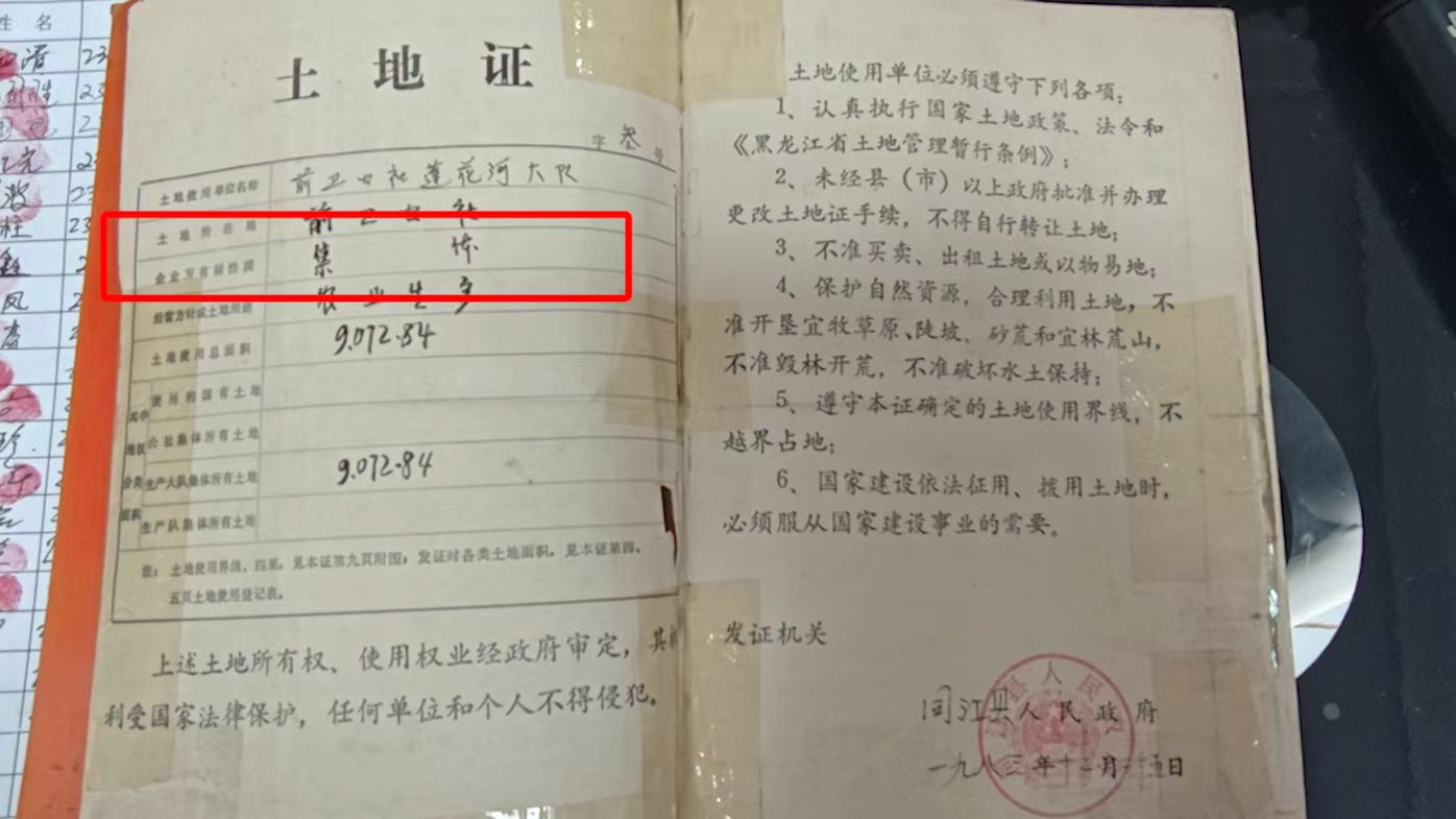 来源于大象新闻记者 2025年12月20日中午,在黑龙江同江市金川乡金江村,村民们手拿着《土地证》和《土地承包经营权证》,向大象新闻·大象帮记者诉说同江市政府用一份废止文件,向他们的集体土地强行征收了13年的土地租赁费。 村民们算了一笔账,同江市共有5个乡镇85个行政村的上百万亩集体土地被市政府变更成了“国有土地”,“这些年土地租赁费就收了十几亿元。”