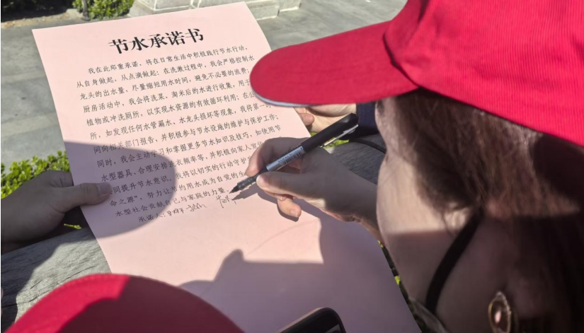 建设水网不易,用水必须珍惜。凌先有指出,对我们普通人来说,必须做到节约用水,健康饮水。要改变浪费水的不良生活方式。厨房淘米洗菜水浇花冲厕;洗澡多用淋浴,少用盆浴;衣物集中洗涤,减少洗衣机水量多次运行;漂洗水拖地擦家具。谈到健康饮水,凌先有说,今年“世界水日”聚焦“水与性别”的意义,除了推动保障女性用水公平,还要根据男女用水需求的差异科学饮水。女性在不同人生阶段、男性因职业不同饮水需求差异明显,需要喝对水、喝够水,守护好自身健康。要坚持“四不”:不少喝水,不要能等口渴才喝水;不多喝水,单次饮水过多会引发“水中毒”;不饮冰水,冰水能引发胃肠道疾病;不饮生水,生水中含有对人体有害的微生物易诱发疾病。水是生命之源、健康之基、文明之脉。我们要从珍惜每一滴水开始,从每一个节水习惯开始,用实际行动支持国家水网建设,守护国家水网珍贵的水资源。 宣讲结束,参加志愿服务的青少年纷纷在《节水承诺书》上签字。表示要在日常生活中践行节水行动,从自身做起,从点滴做起,以实际行动守护好水资源,为创建节水型社会贡献自己与家庭的力量。一位叫胡子萱的同学还写了自己的倡议书,倡议大家缩短用水时间、用水后随手关水、看见漏水及时去管,提醒家人一起节水。 凌先有还带领大家一起来到北京节水展馆,帮助大家了解水的知识、节水器具、日常生活与节水技巧等。