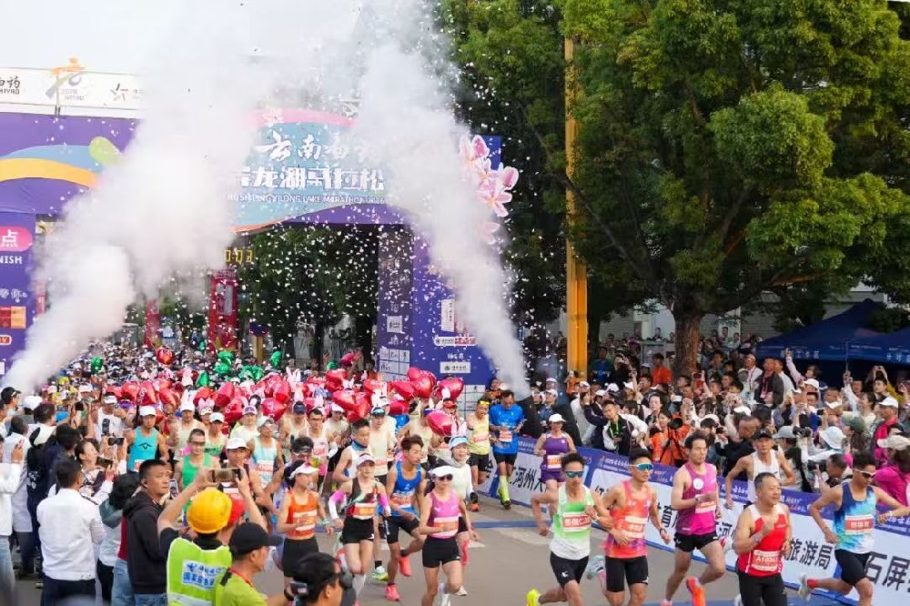 凤凰新闻网络电视台(记者丁琼玉)4月19日上午“神豆花开 石屏等你”2026云南白药石屏异龙湖马拉松鸣枪开跑。 赛事设马拉松、半程马拉松两个项目共吸引6000名选手参赛。 异龙湖畔,神黄豆花竞相绽放,跑者穿梭其间如在画中奔跑,尽享春日浪漫。(来源于云南红河发布)